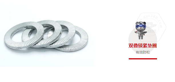 特點(diǎn):雙疊鎖緊墊圈適用于振動(dòng)劇烈的場合,通過楔形防松原理,可以起到有效的防松作用。
